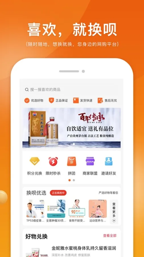 蚂蚁换呗,全新的积分兑换电商购物,更懂消费者的手机购物APP。打通线上/线下商户新营销,用户消费送等额积分,在商城兑换的商品包邮到家,无需额外一分钱。众多用户在APP拼团,和你亲朋好友一起拼,严选好物商品更低价,包邮送到家,分享实惠,分享乐趣。