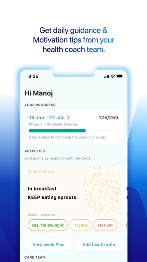 The patient is given a dedicated health coach to which they have 24x7 complete access. The coach supports them and guides them through all the changes required for managing diabetes. A personalised treatment plan is designed according to the needs of the patient.