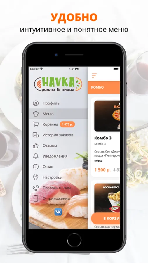 Приложение Havka Шарья — это удобный способ заказа еды домой или в офис. Всегда в нашем меню - вкусные роллы, пицца, вок, закуски, салаты.