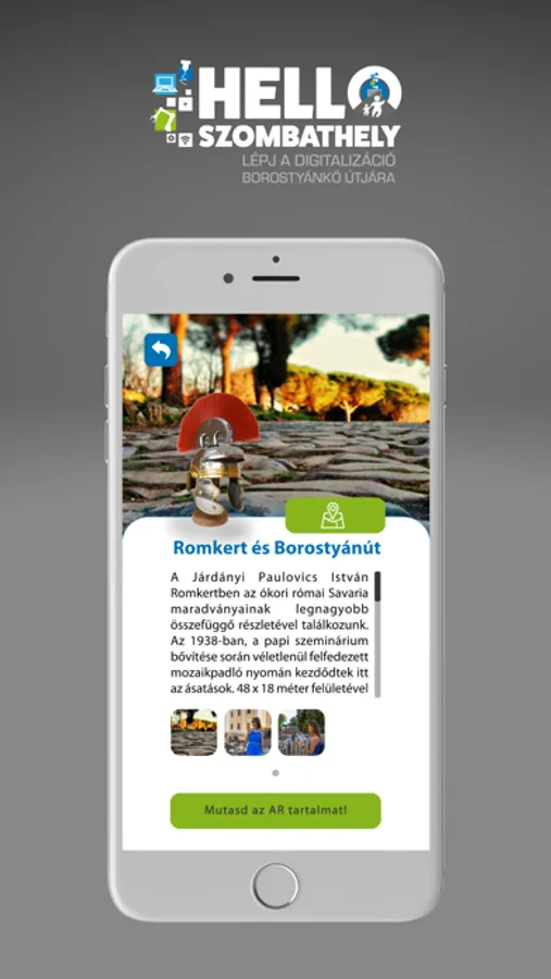 The Hello Szombathely application is an innovative digital tourism service, which is a good opportunity for the local population and those who come to the city to expand their knowledge within the framework of leisure activities, and strengthening the identity of local residents as well as providing group adventures. With the application, the user can learn about the more than two thousand years history of the former Savaria with the help of an experience-based augmented reality (AR) solution.