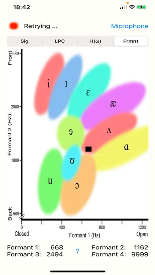 前两个共振峰频率用于在标准元音图上以图形方式显示口语元音的位置。 指示灯会改变其颜色以显示应用程序的状态。