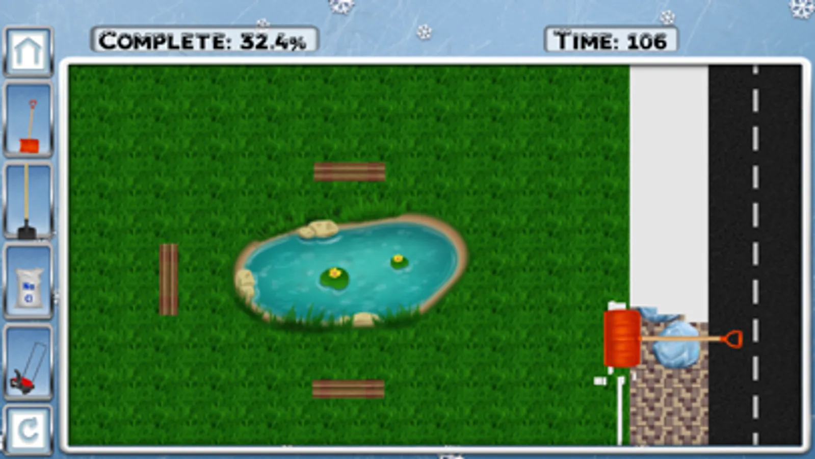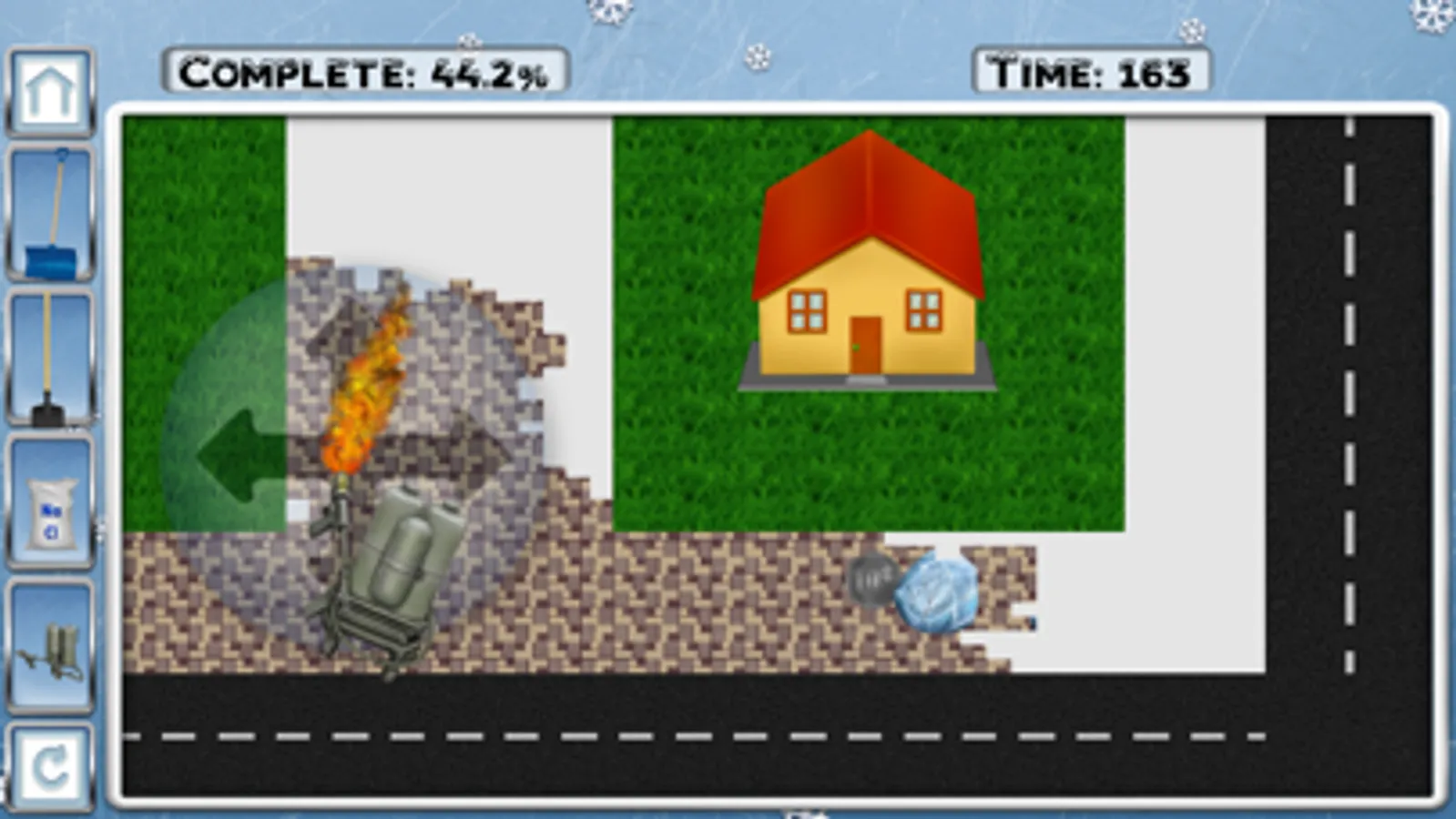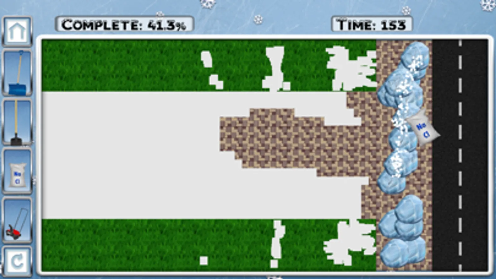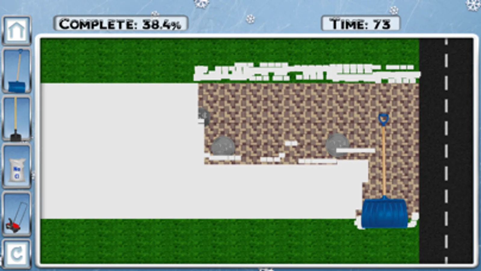 Snow Shoveler contains a tutorial on using all the tools and a campaign with 50 levels. Here, players will begin by shoveling light snow and chipping away thin pieces of ice. In doing so, Canadian coins will be found and rewards will be collected for completing a level. These coins will be used to unlock bigger shovels, stronger ice picks, and better snow blowers. All of these new items will be needed to complete harder levels in the campaign.