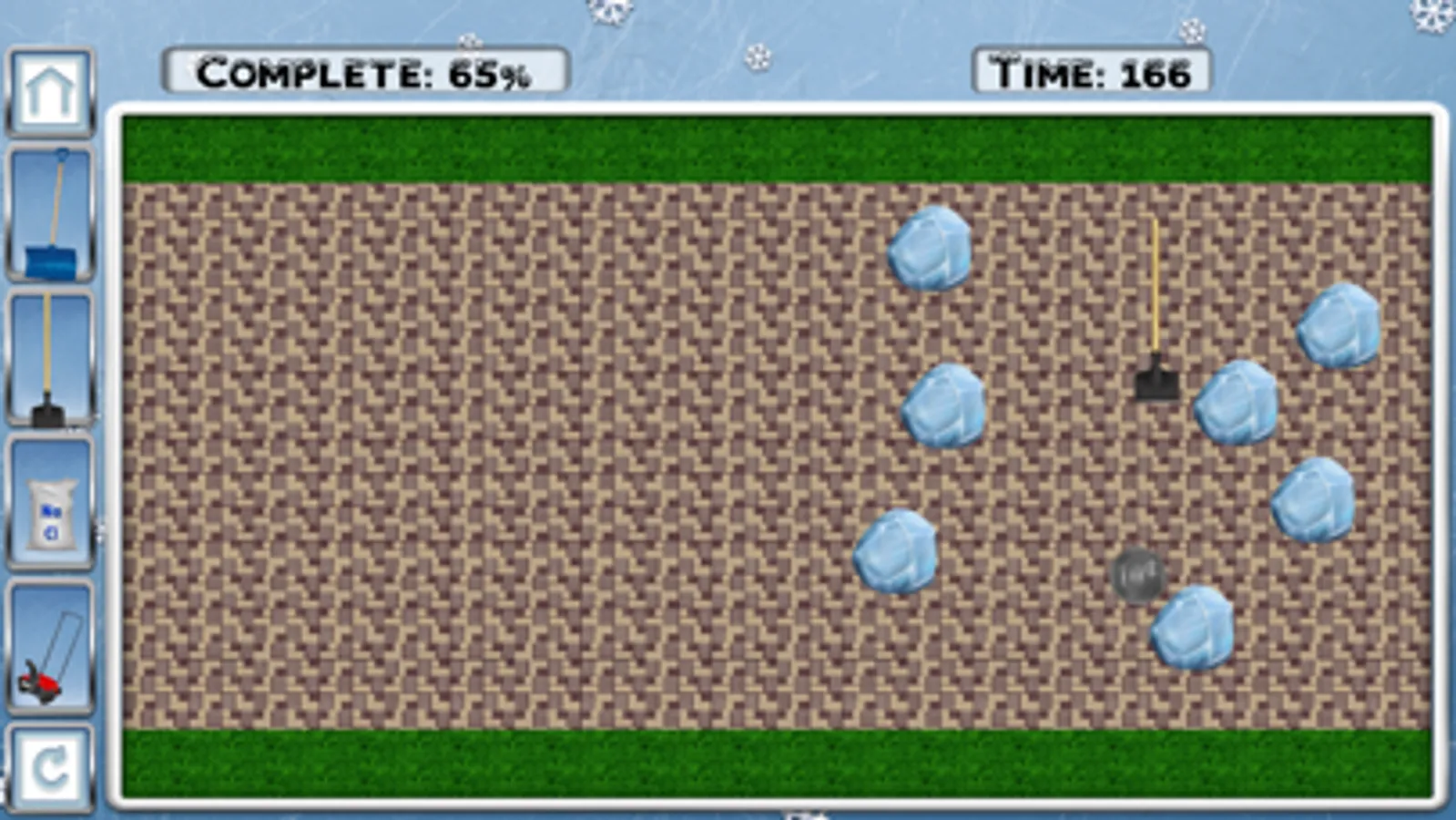 The goal is to clear as much snow and ice off of the sidewalks as fast as you can. While clearing the snow, the player will find pennies, quarters, loonies and other coins buried under the snow and ice. The player can use these coins to unlock a variety of items to help them clear the sidewalks such as: shovels, ice picks, ice salts, snow blower and even a flamethrower. All of these items will help the player clear driveways, parks and sidewalks after a snowstorm.