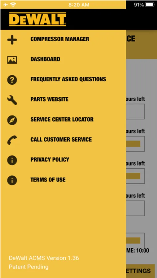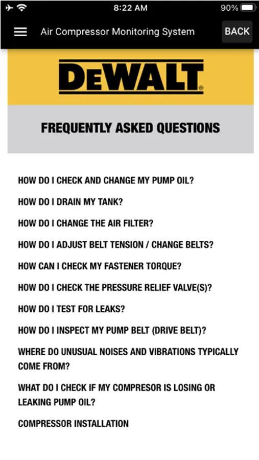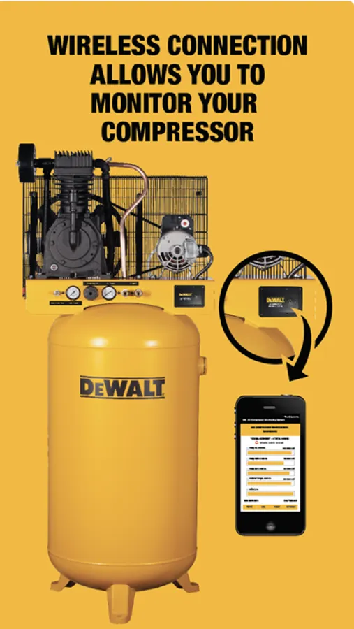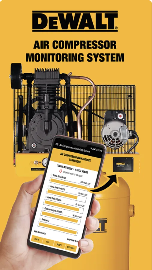 -Simply choose your specific DEWALT air compressor model number within the app, and pair the app with the monitoring device mounted on your air compressor, to begin recording run time.