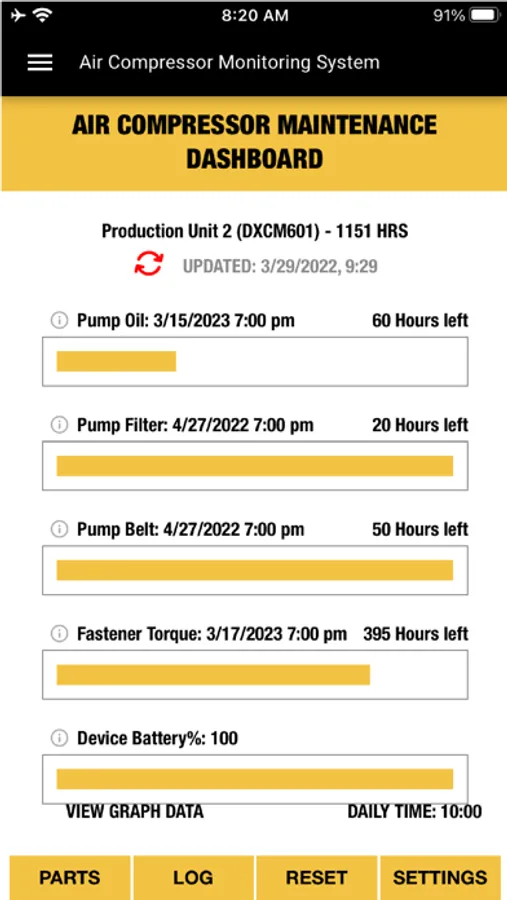 Use your device to monitor the number of hours your air compressor is running and receive maintenance data on your phone.