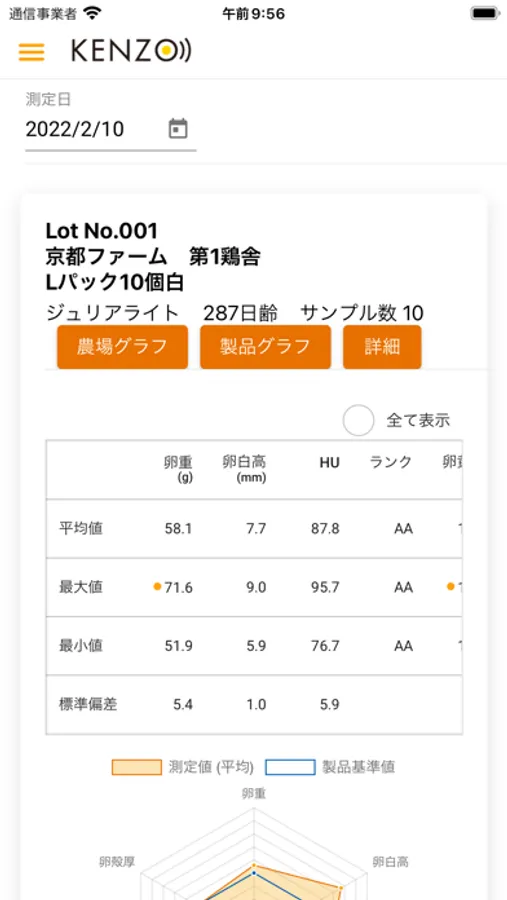 関係者と迅速に情報共有できるほか、測定データはグラフ化され、各ロットの卵質推移を視覚的に把握できます。