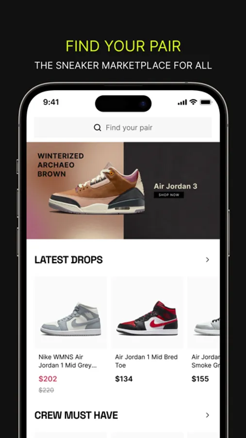 Browse one of the world's largest sneaker marketplace to "Find Your Pair." The CREW App allows you to access an inventory of over 400,000 styles, make purchases on authenticity-guaranteed items, and track order information effortlessly on your phone.