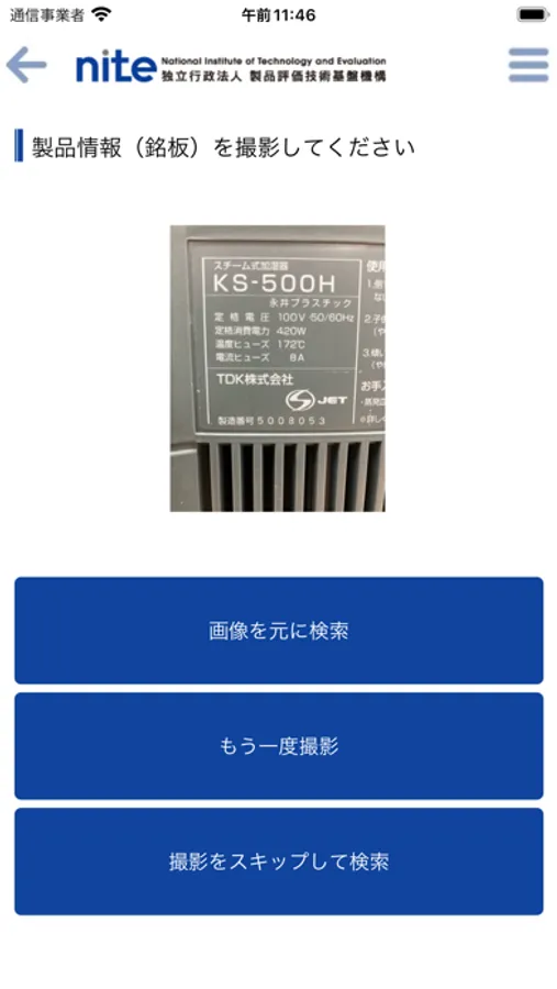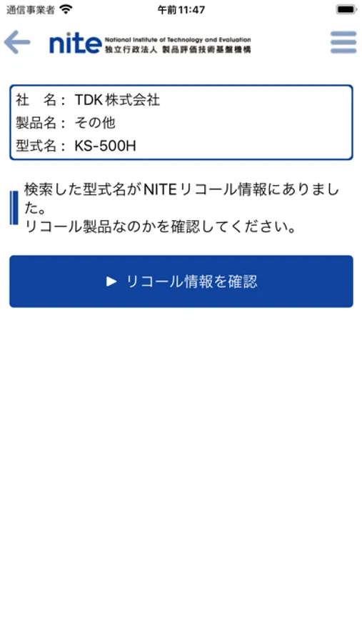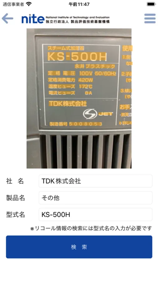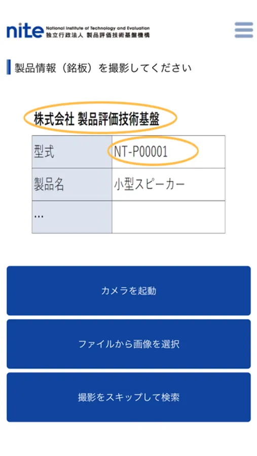 本アプリで、製品に表示されているメーカーや型式が書かれた銘板をカメラで撮影、または製品の型式等の情報を入力すると、リコール情報がある場合はその情報をお知らせします。リコール情報がない場合はNITEが作成した注意喚起動画やポスターをご紹介します。