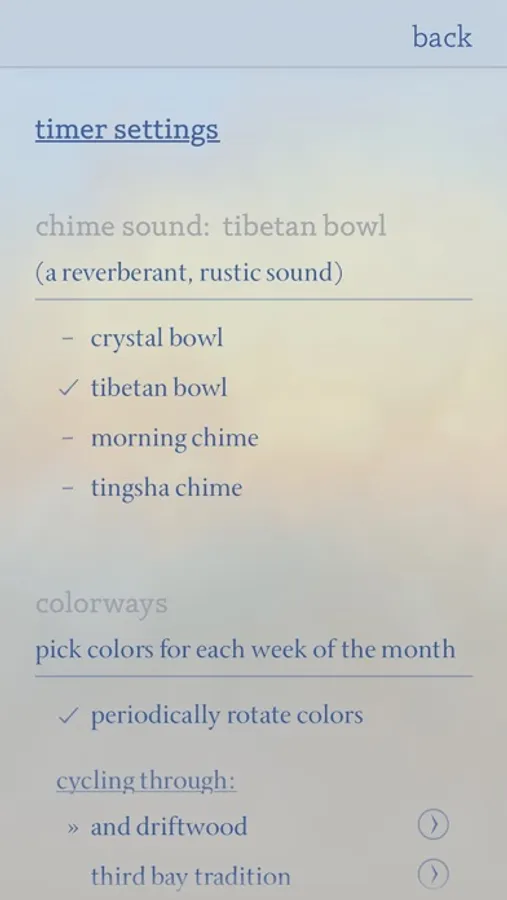 Moonstone Chimes is a simple and artistic take on the meditation / yoga timer. Tailor the timer to your practice with presets and colorways arrangements.
