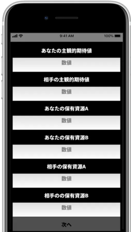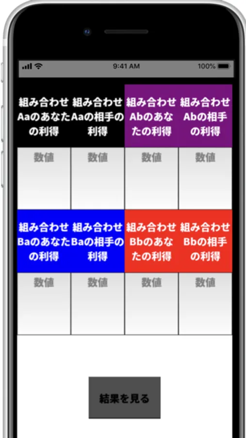 本アプリは自分で各種パラメーターを入力することによって、パレート最適直線とナッシュ均衡を自動で算出し結果を教えてくれるアプリである。