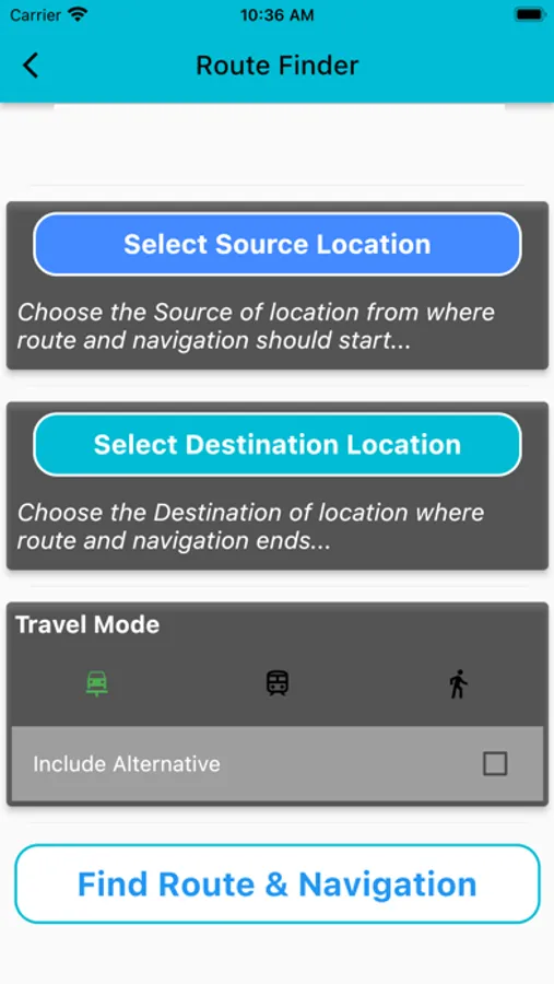 Easy to select source and destination locations from Map or by typing the name of place and selecting from suggested places list.