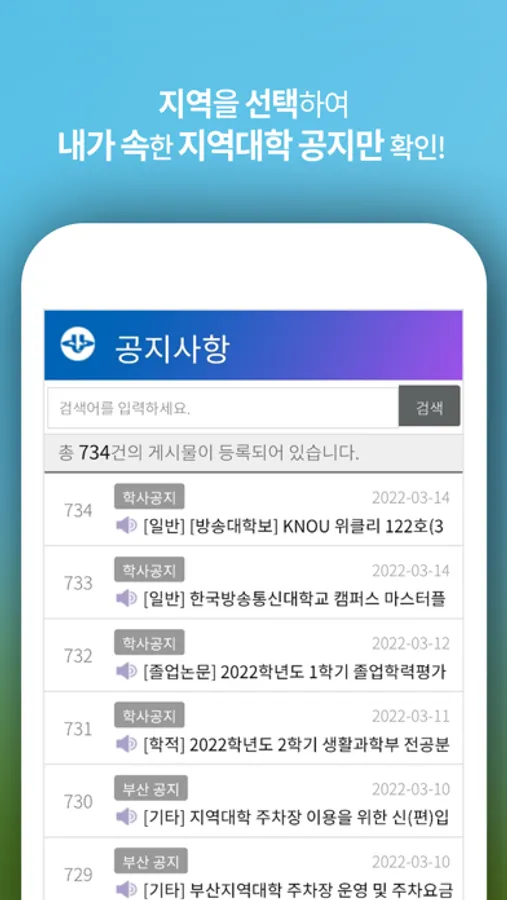 - 지정된 지역 대학 공지 게시물 확인 기능 제공