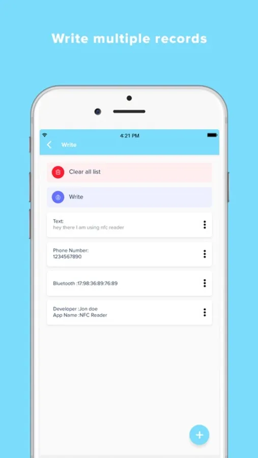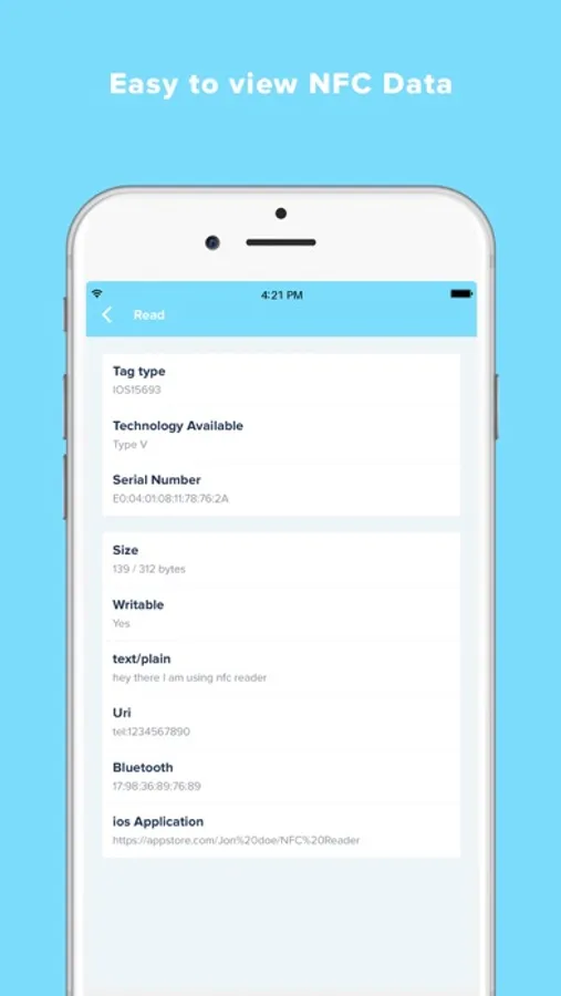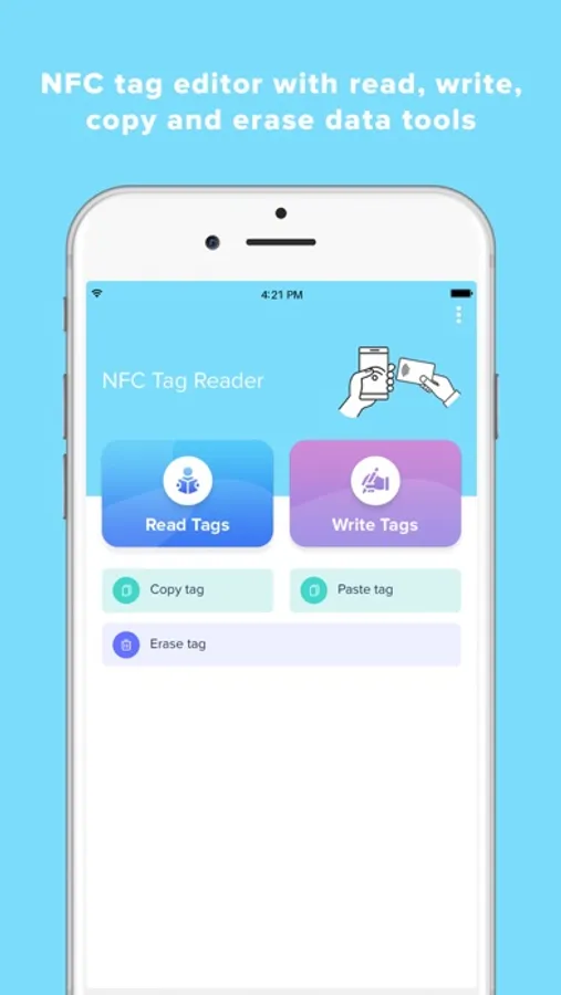 To use NFC Tag Writer & Reader, you have just to hold a tag or a card against the back of your device to read it. App lets you copy the content of the tag to infinite tags.