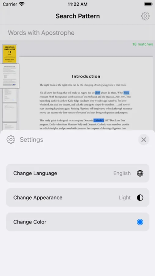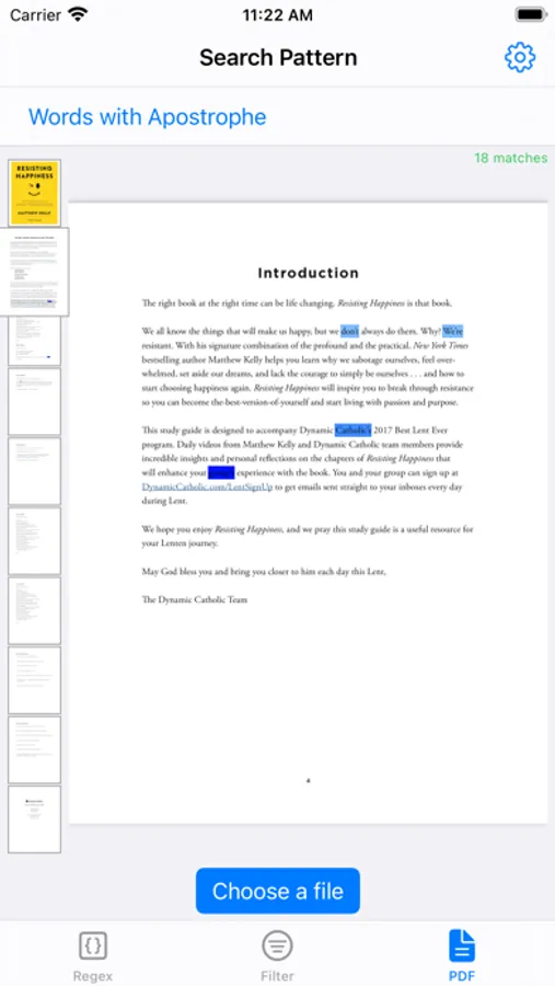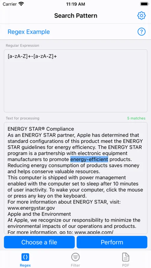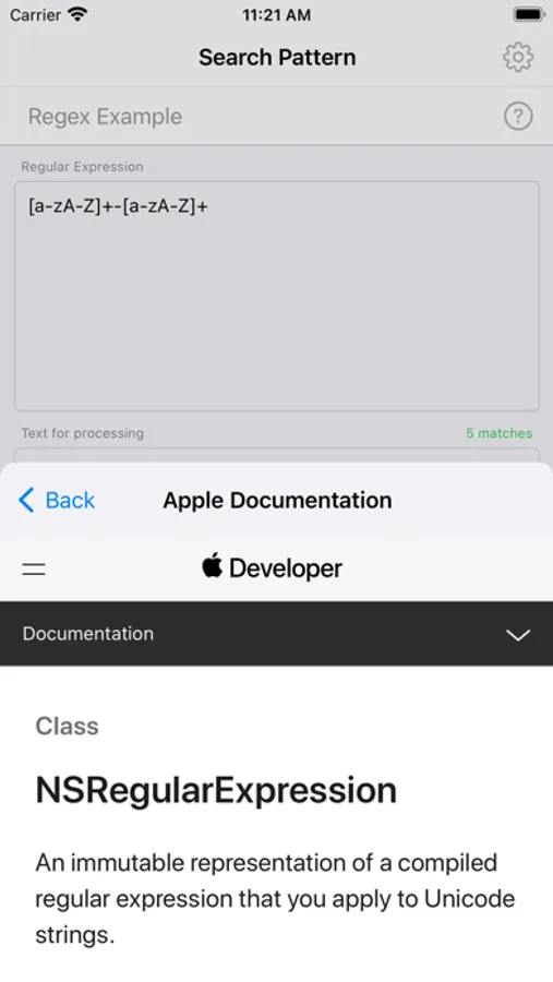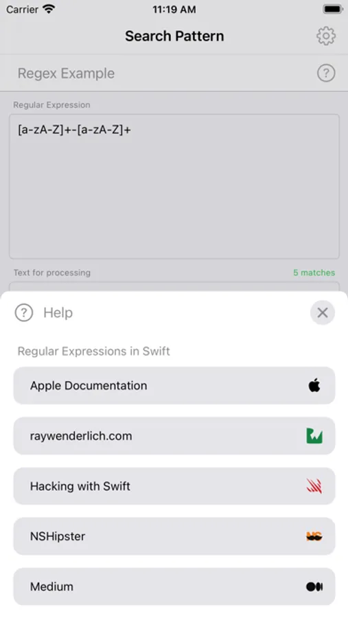 Search Pattern allows you to write your regular expression and search by this in your text. Also, you have the opportunity to get help and some tips about creating this in Swift.