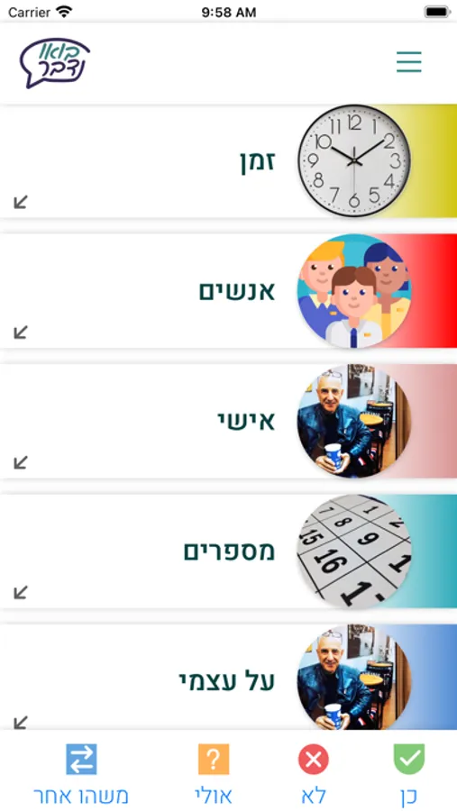 לוח תקשורת שמותאם לחולי אפזיה לטלפון הנייד. כאשר מטופל לוחץ על מילה או משפט זה מקריא בקול את המילה או המשפט.