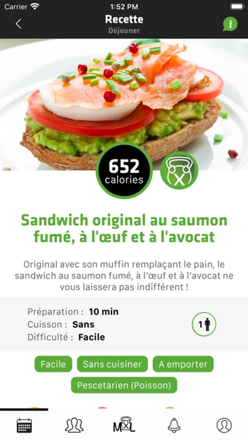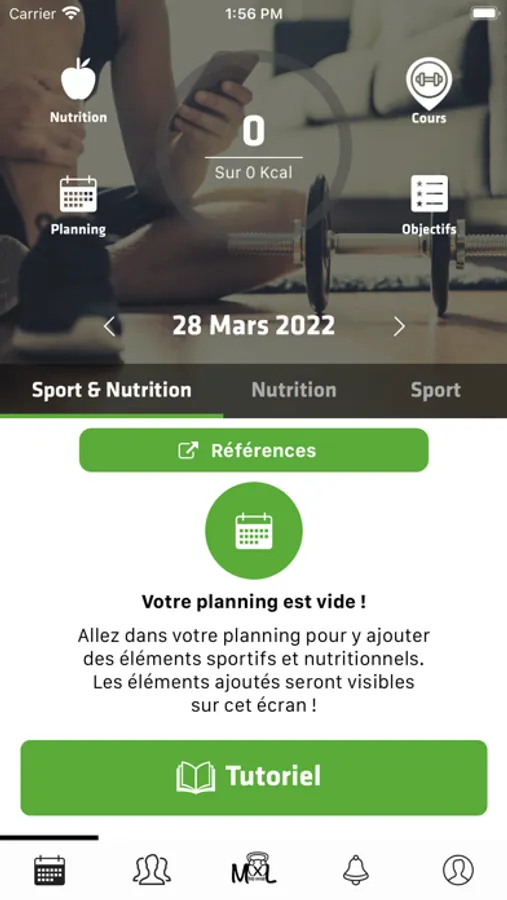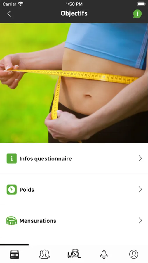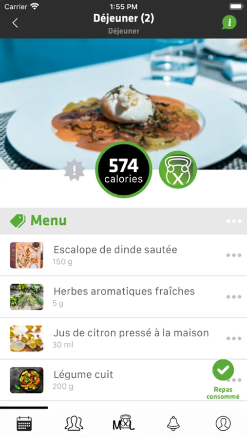 Dans celui-ci vous trouverez votre objectif calorique journalier mais aussi vos différentes activités et repas mis en place au préalable par nos soins.