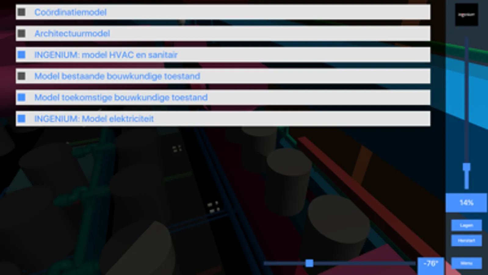 Selecteer een model, filter de lagen en verken het BIM model.