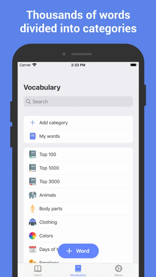 • Thousands of Portuguese words and phrases divided into thematic categories, including the most commonly used words in Portuguese. Choose the category you want to learn this time and change it whenever you want.