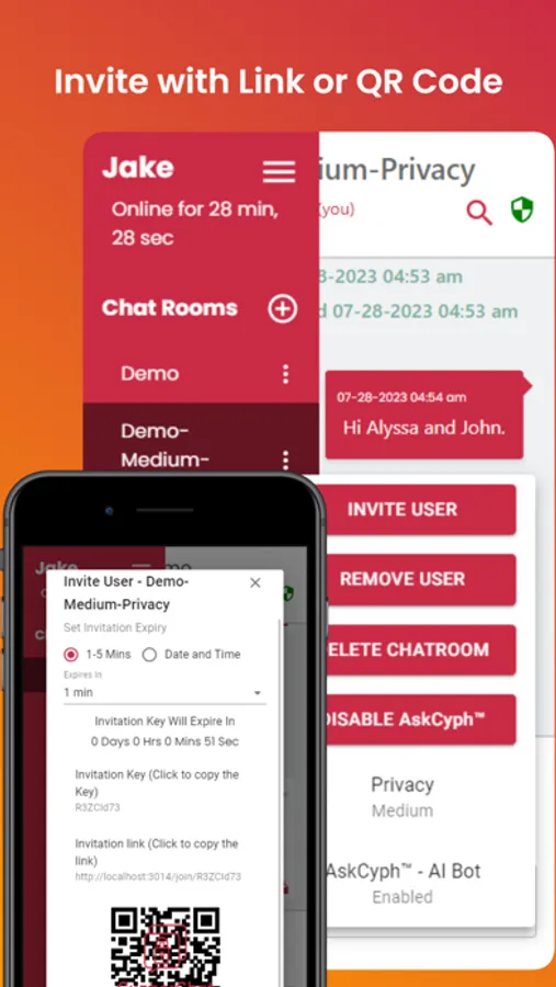 Invite & Share Securely: Share your CypherChat link or QR Code with custom expiration, ensuring only the right people join your conversations.