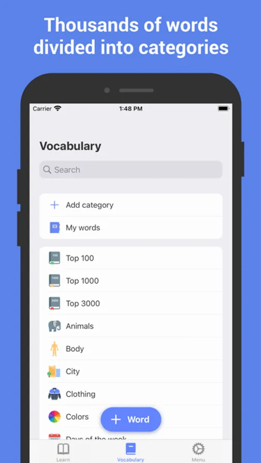 • Built-in dictionary contains thousands of Russian words and phrases divided into categories. It includes the most frequently used Russian words, as well as some other thematic topics.
