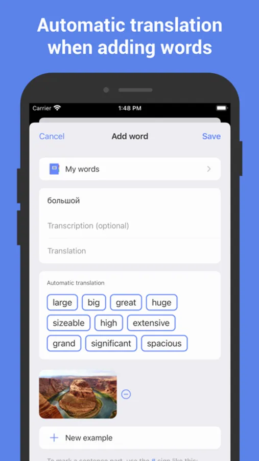 • Easily add your own flashcards: translations, pictures, and example sentences are automatically filled in.