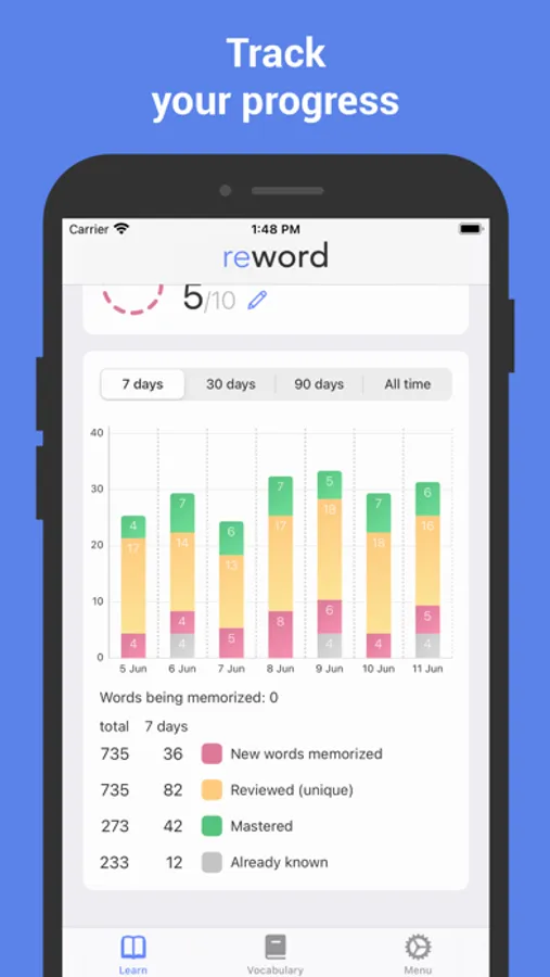• Learning stats: Track your word memory over the past week, month, three months, and year.