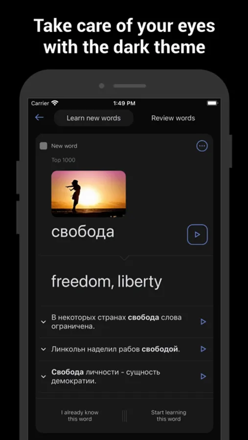 • Night theme for comfortable Russian learning before bed.