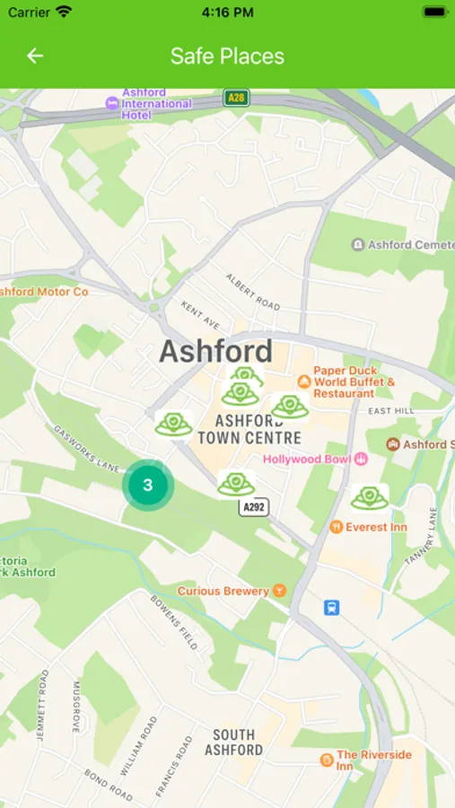 Ashford Community Safety Partnership cares about the safety of those that live, work or visit the Town Centre of Ashford, Kent. The Ashford Streetwise App allows you to plan your routes in and around the town centre. It also enables you to pick the safest possible route to get to your destination using information such as CCTV camera locations, street lighting, community guardians and safe spaces. This route is shown in colour on a map for you to follow.