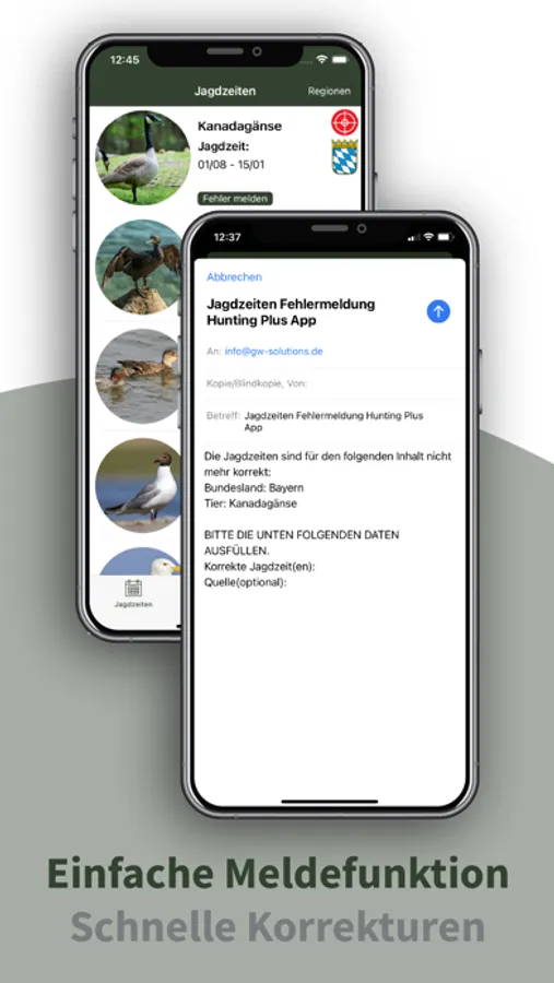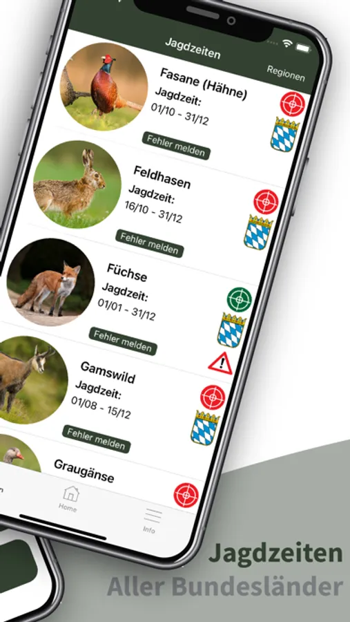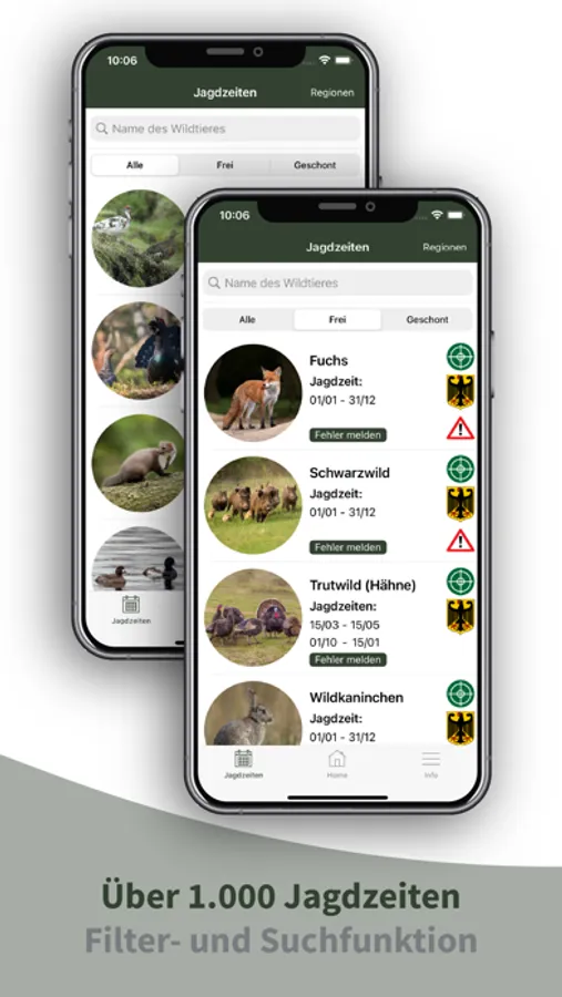 In dieser Rubrik bieten wir eine Datenbank mit über 1000 aktuellen Jagdzeiten, welche permanent aktualisiert werden. Alle 16 Bundesländer werden aufgelistet. Suche dir einfach über die clevere Filterfunktion das gewünschte Bundesland aus. Die Jagdsymbole verschaffen dir außerdem einen schnellen Überblick über den Jagdstatus des Wildtieres. Wähle bei Bedarf zusätzlich zwischen geschonten und freien Tieren. Dich interessiert nur ein bestimmtes Wildtier? Nutze das Eingabefeld und schon wirst du fündig. Neben dem Namen bieten wir zusätzlich ein professionelles Foto des entsprechenden Wildtieres an, welches bei Bedarf vergrößert und genauer inspiziert werden kann. Jede Fehlerermittlung kann schnell und einfach über einen integrierten Button mitgeteilt werden. Fehlerkorrekturen erfolgen schnellstmöglich und meist innerhalb 48 Stunden.