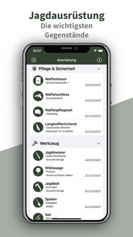 In einer strukturierten Übersicht werden dir die wichtigsten Gegenstände, die für die Jagd erforderlich sind, angezeigt. Prägnante Texte und Bilder erleichtern dir die Auswahl dein ideales Ausrüstungsset zu finden. Jeder Gegenstand erhält zusätzlich ein echtes Produktbeispiel. Viel Spaß dabei deine Ausrüstung zu finden oder zu erweitern.