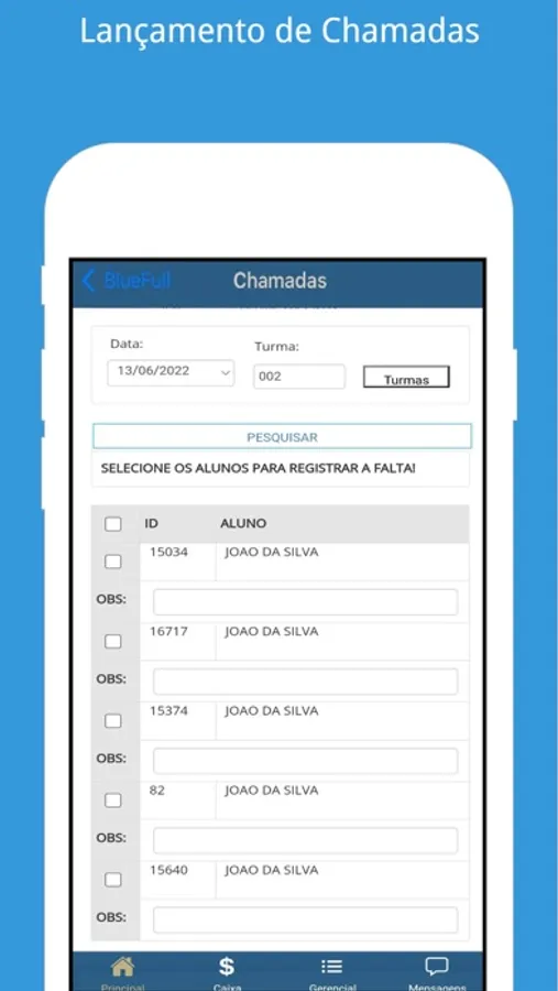 - Lançamento de faltas e presenças via lista de chamadas;