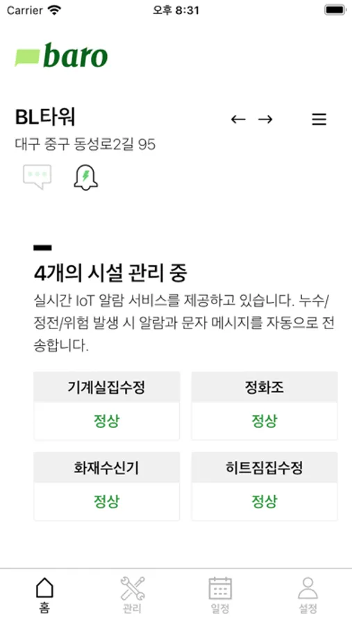 스마트 시설관리 '바로'는 시설관리를 효율적이고 쉽게 만들어 줍니다. 이 앱은 고급 IoT 기술을 활용하여 실시간 알람 서비스를 제공하며, 다양한 위험 상황에 신속하게 대응할 수 있도록 지원합니다.
