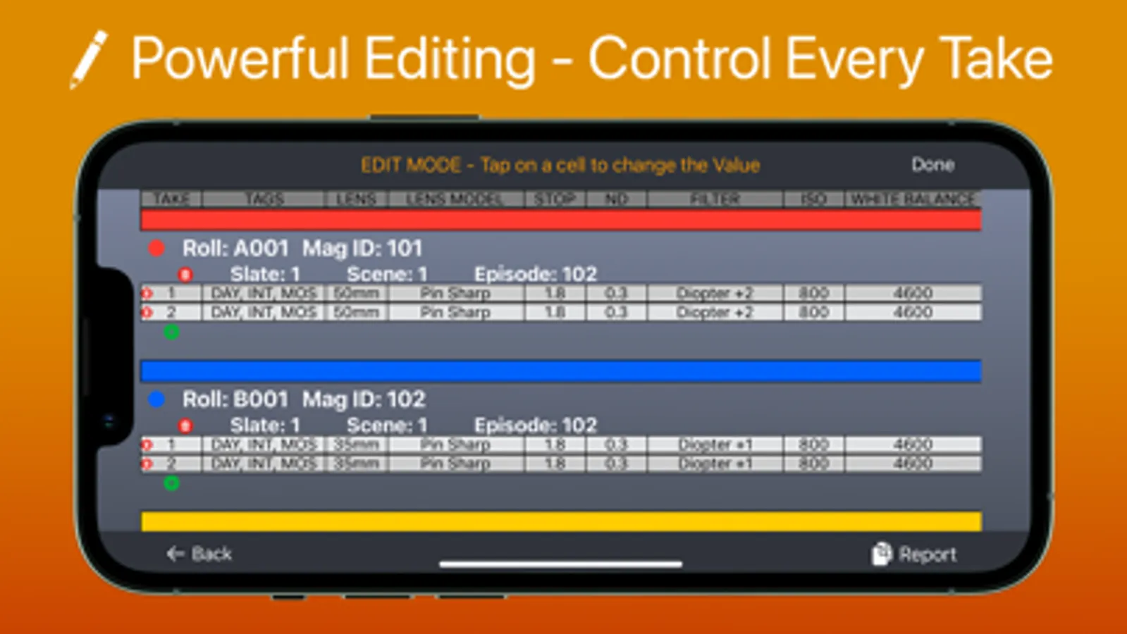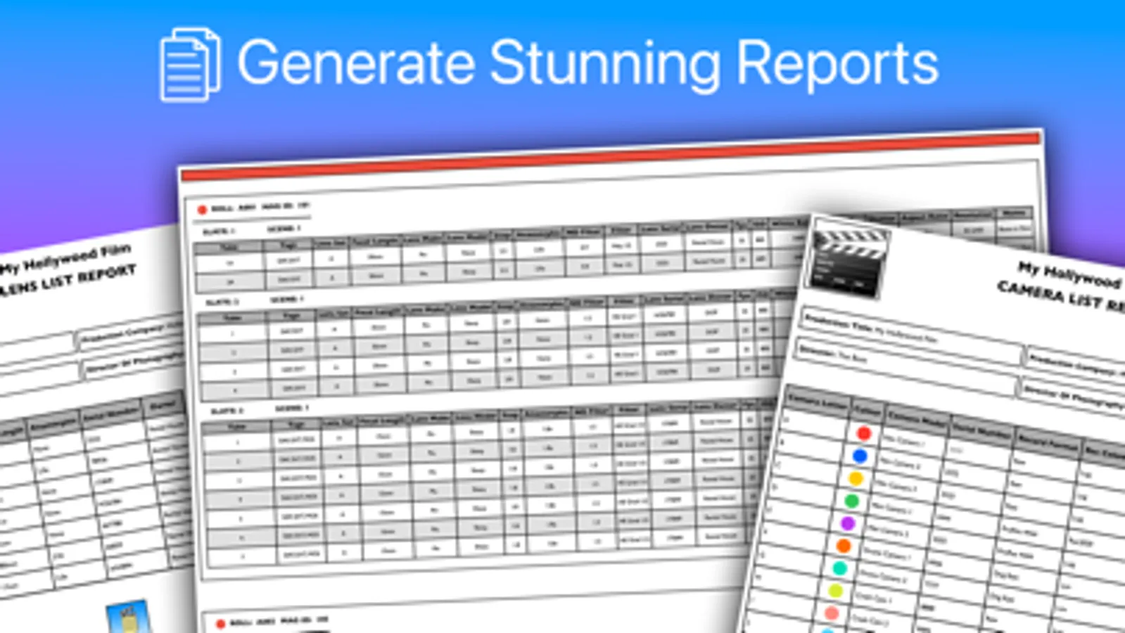 CREATE - make a project and optionally customise with a logo. Add cameras, rolls and shoot days. Save lenses, filters, LUTs and crew members to quickly fill in information. Have your whole production close at hand to always know what slates, cameras and rolls you are on. Inbuilt U.S and U.K quick slating with a special mode for episodic shows. Generate PDFs and CSVs. Also generate camera list and lens list reports for production, edit and post.