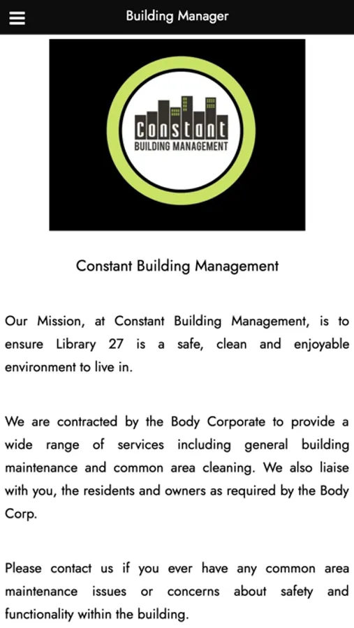 This application designed by Constant Building Management provides everything you need to know about living at Library 27, 27 Rutland st. It has been designed to provide useful information about the building and as a convenient way of staying informed about the rules, events or changes happening in or around the complex.