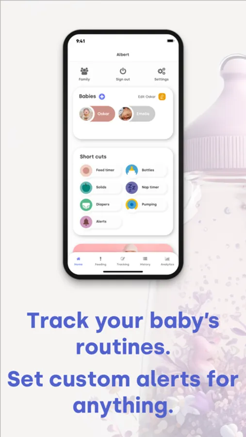 › Custom alerts. Set your notifications, like tummy time or medications.