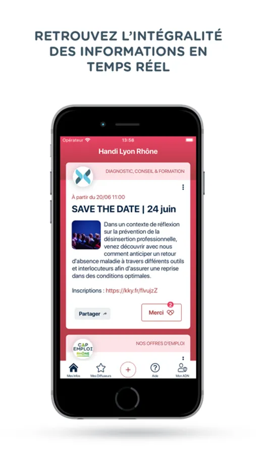 Notre application vous permet de recevoir en temps réel toutes les dernières offres d’emploi à destination des personnes en situation de handicap, nos actualités, les prochains événements ainsi que nos offres de formation.