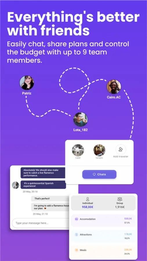 Group Planner - Plan your trip with friends and family! Our Group Planner feature lets you organize trips for up to 10 people. Coordinate your itinerary, share travel tips, and collaborate with ease. Create the perfect trip together with Travelook!