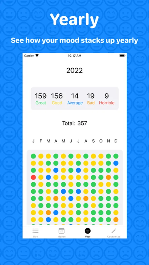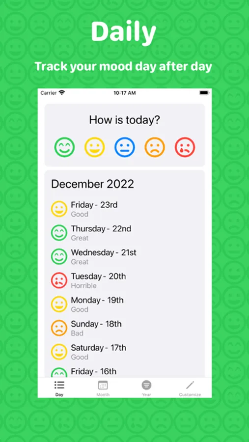 Feels was designed to be the easiest and fastest way to rate your day. With a single tap in the app or from its notification, you can record a rating of your day. iFeels lets you select one of five options ranging from “Great” to “Horrible” to capture an accurate representation of your life. With vibrant Day, Month, and Year views, your data is cleanly laid out to give you easily understandable insights. And with the option of a daily reminder notification, you'll never forget to rate a day. The more days you rate, the more insight you’ll get into your life.