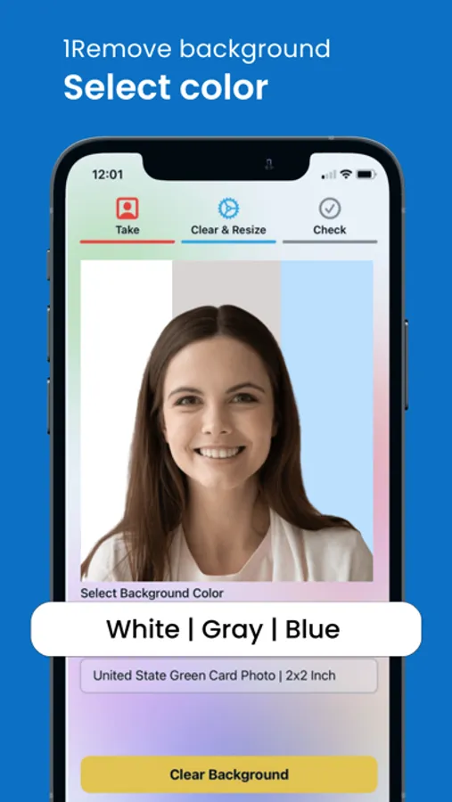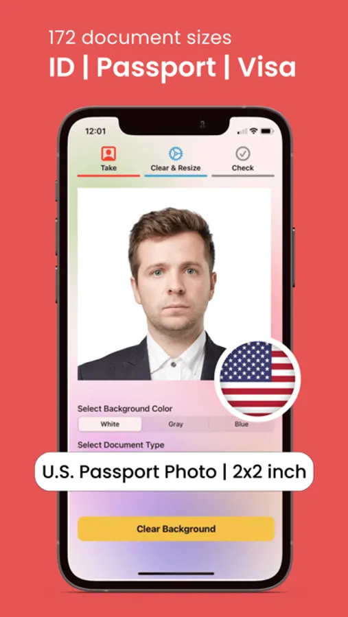 - Clear background using auto editing tools to acceptable Passport Standards.