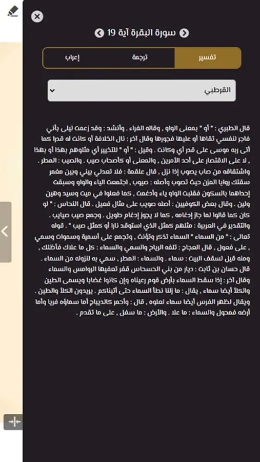 - View the explanation and parsing of each verse in a matter of seconds. There are 9 different Arabic Quran explanations (tafsirs) available, such as Ibn Kathir, Al Tabari and Al Moyasar–which can be viewed simultaneously. You can also find the explanations in different languages (English, Russian and Indonesian).