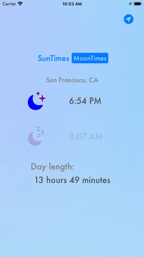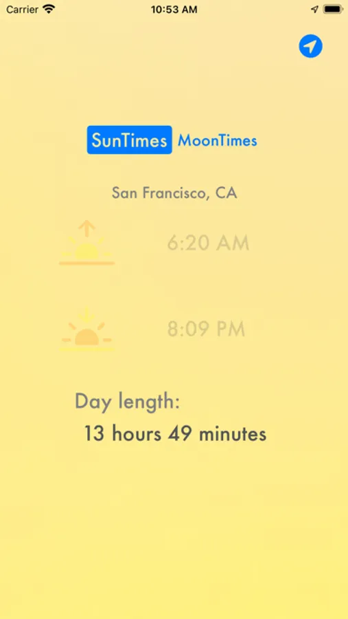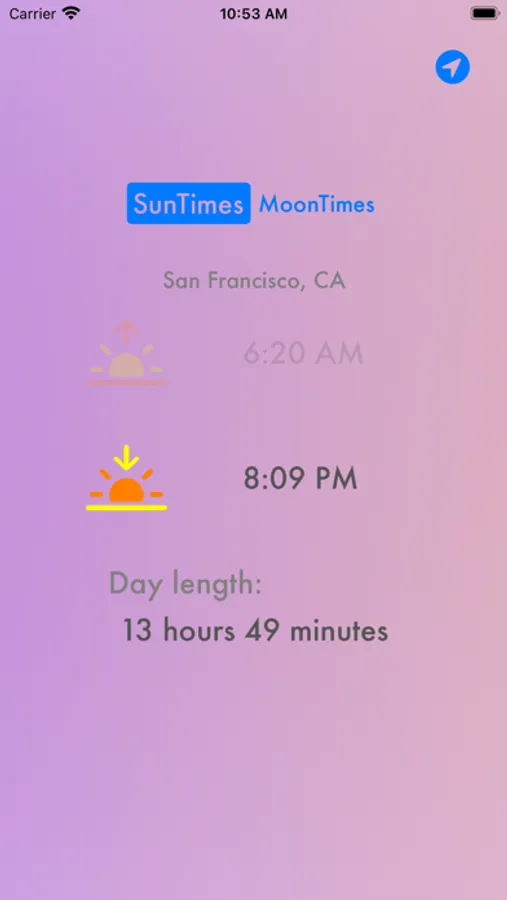 Looking for a simple way to find the Sun and Moon times wherever you are in the world? With a simple tap of the location, and some fun colorful backgrounds to match the time of day, Sunrise & Set is a simple app for you to find your location and display the Sunrise, Sunset, Moonrise, and Moonset times.
