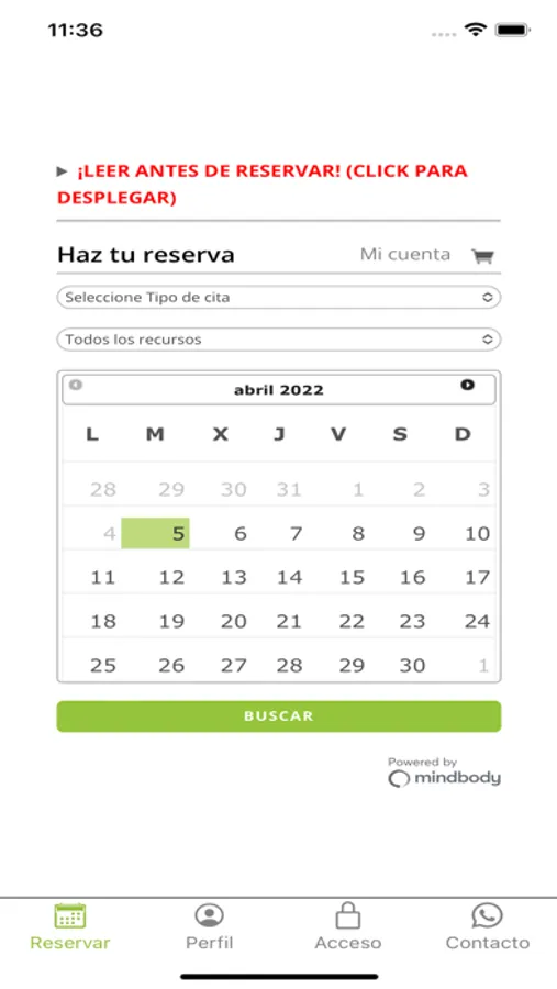 En la pestaña “Acceso” encontrarás la información sobre el acceso al centro, así como toda la información sobre tus reservas del día.