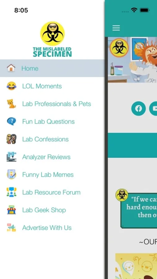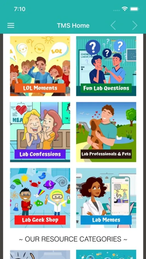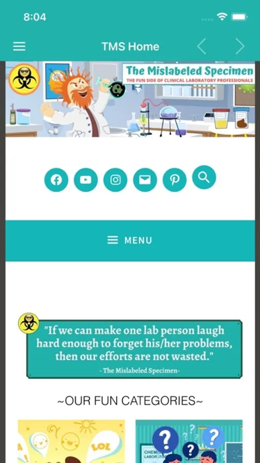 The Mislabeled Specimen (TMS) is an entertainment and resource app with categories like LOL Moments, Fun Lab Questions, Lab Confessions, Lab Resource Forum, Lab Professionals & Pets, Analyzer Reviews and Lab Geek Shop.
