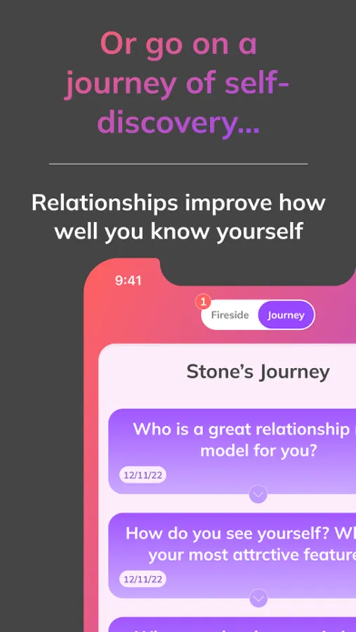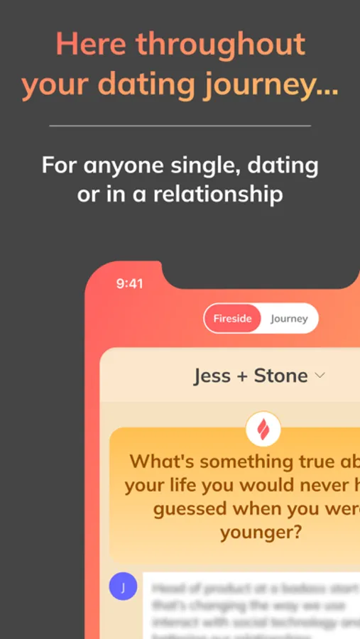 Fireside is the first app helping you throughout every stage of your dating journey: exploring single life, talking to a few people, in a long-term relationship, or recently broken up. We’re here to help you find dating success and build the relationship you’ve always dreamed of.