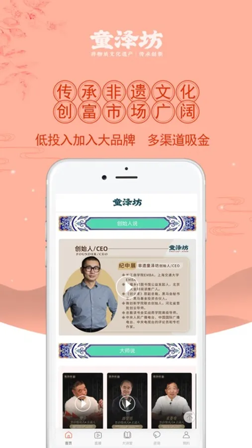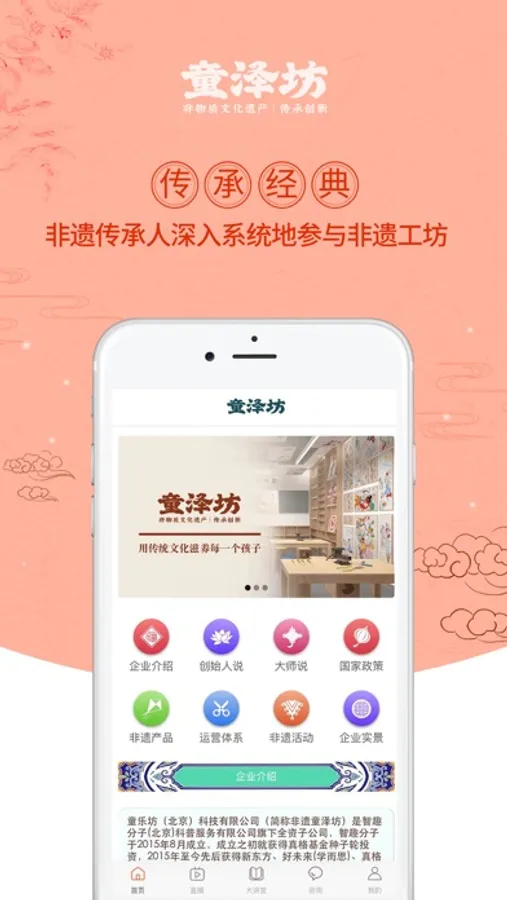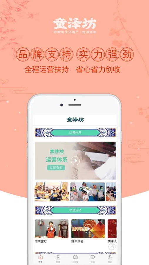 企业全方位展示:各版块清晰介绍企业的荣誉资质、产品体系、运营体系、传承大师以及品牌活动。通过企业实景视频,给各位创业者真实展现总部的规模、环境,您不用实地考察也能直观了解项目。创始人及企业高管的访谈视频,为创业者讲解“非遗童乐坊”的核心竞争力。