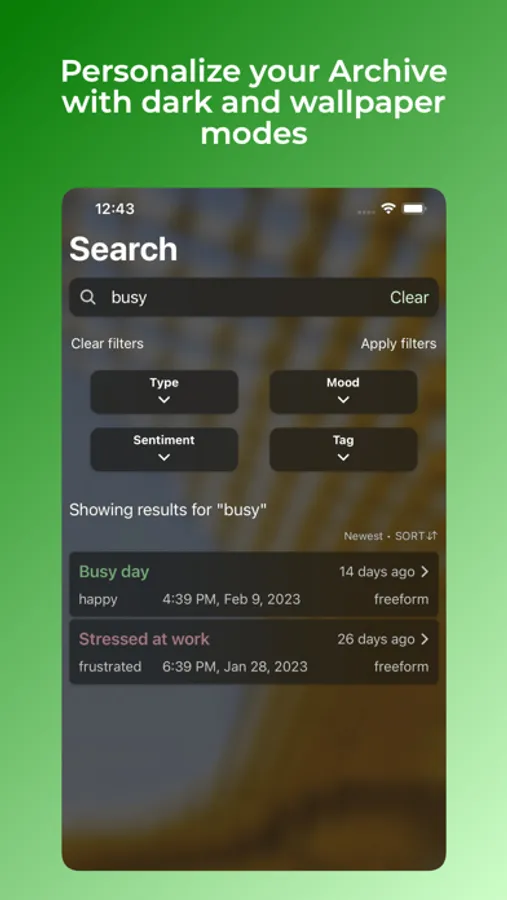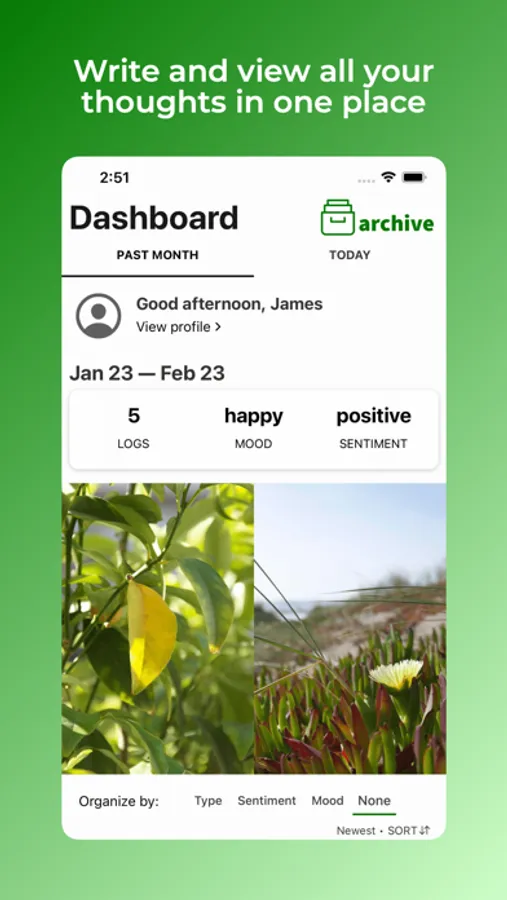 Archive is the ultimate journaling app for anyone who wants to capture their memories and reflect on their life, without the hassle of traditional journaling methods. With machine learning algorithms, Archive makes it easy to create and organize journal entries, and even allows for offline journaling. Add photos, tags, and location to entries, and use search to quickly find what you're looking for. Explore your past entries with a calendar view that includes sentiment insights and trends.