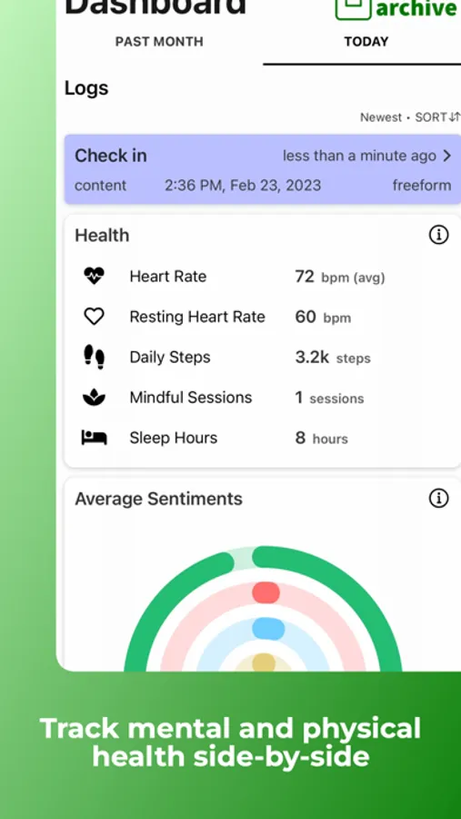 Share your logs with friends and family through email, SMS, or social media, and export your entries as images. Set reminders to journal and even use Archive to track your health and fitness goals. With Archive, you'll have the power to live a more conscious and reflective life, every day.