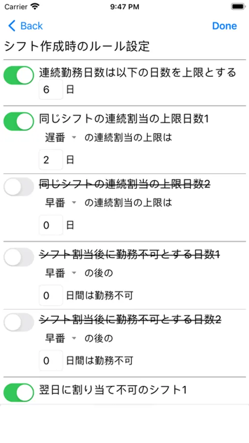 ・あるシフトの後に割当不可のシフトの設定。遅番の後に早番の割当は不可など。
