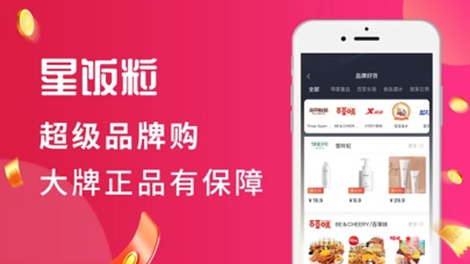 星饭粒与大牌商家合作,每天精选推出近万件优惠商品,只专属供给星饭粒用户。