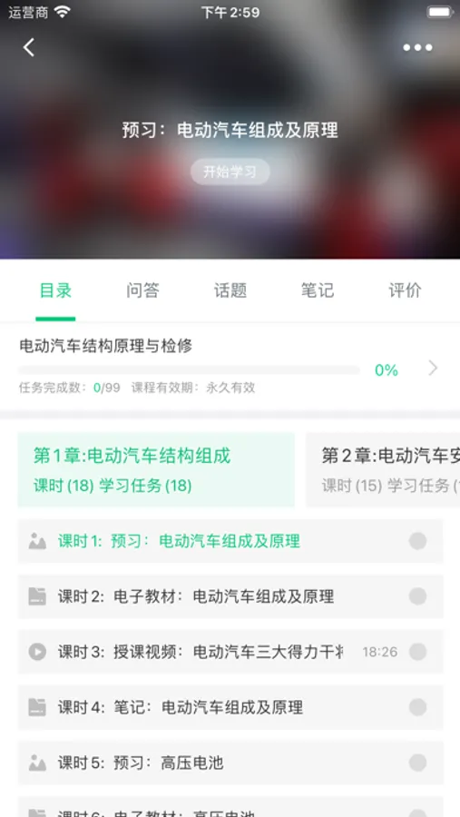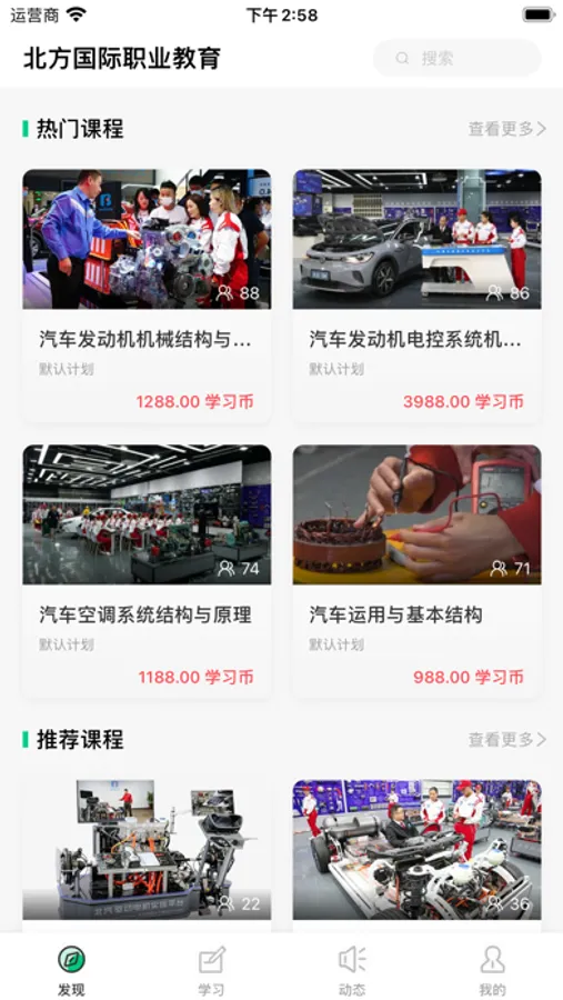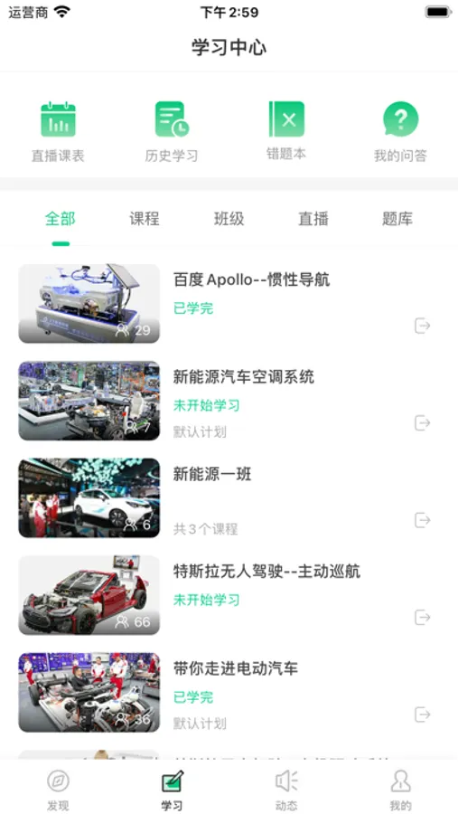 APP分为精品课程、中高职课程体系、新能源汽车维修、智能网联汽车及无人驾驶、氢能源汽车等板块,涵盖以下科目:汽车发动机构造与维修、汽车底盘构造与维修、汽车电气设备构造与维修、汽车空调、汽车发动机电控系统检修、汽车底盘电控系统维修、汽车综合故障诊断、汽车营销实务、驱动电机及控制技术、动力电池管理及维修技术、纯电动汽车构造与检修、混合动力电动汽车构造与检修、新能源汽车底盘构造与检修、新能源汽车综合故障诊断、智能网联驾驶汽车、氢能源汽车。